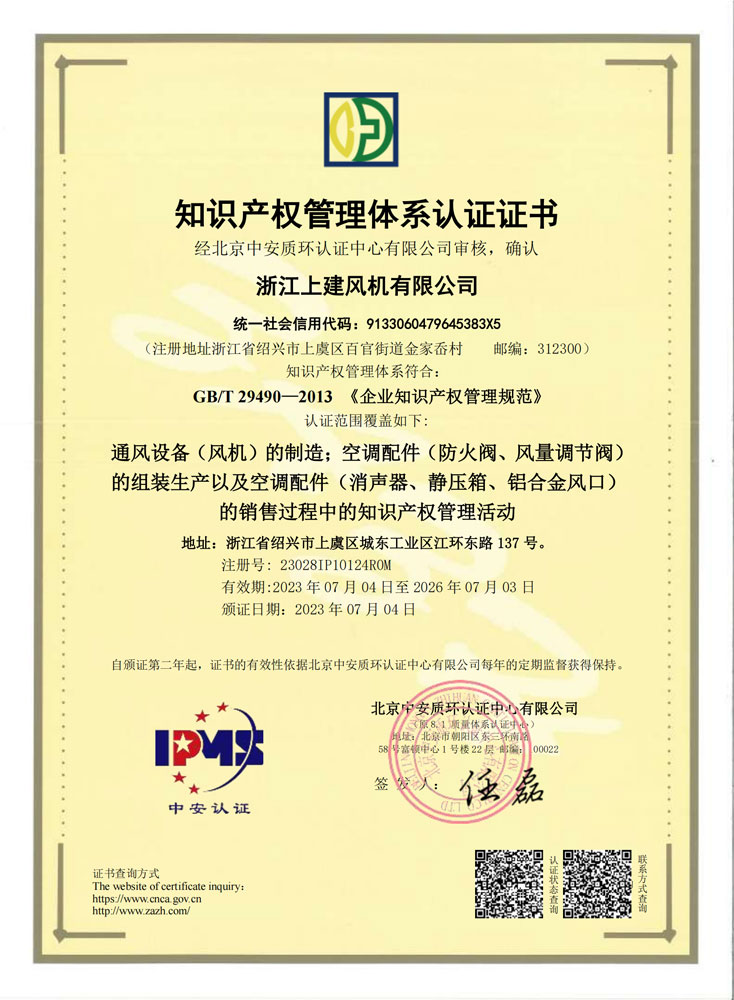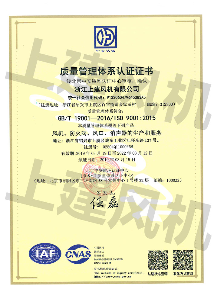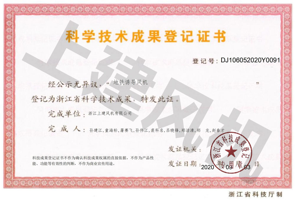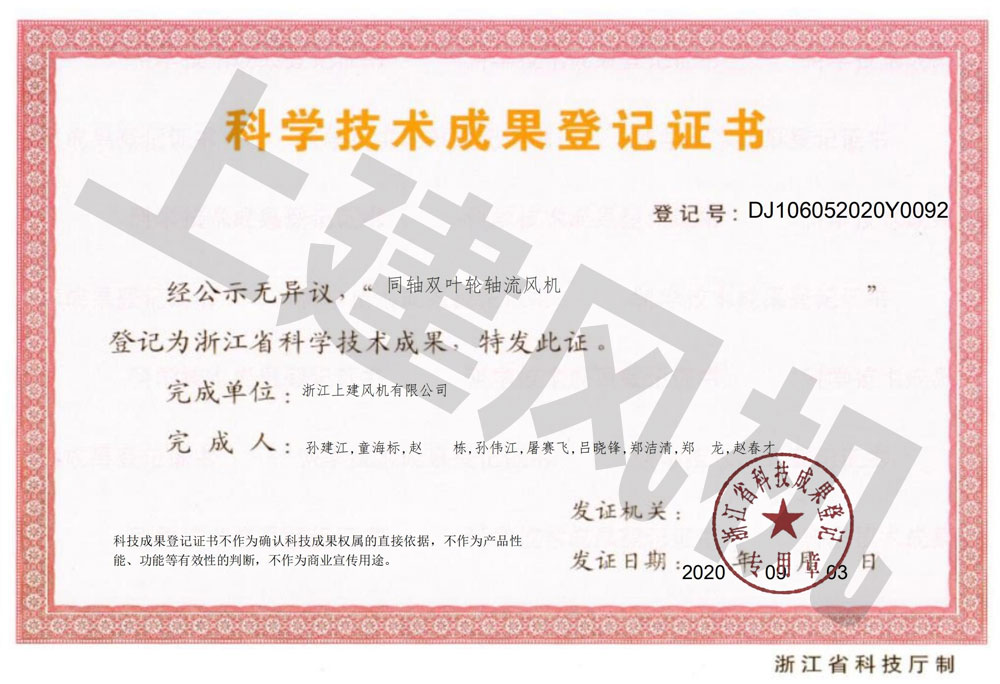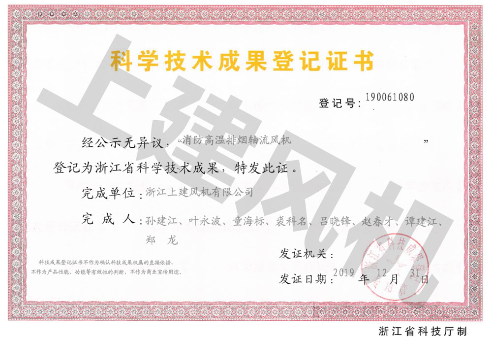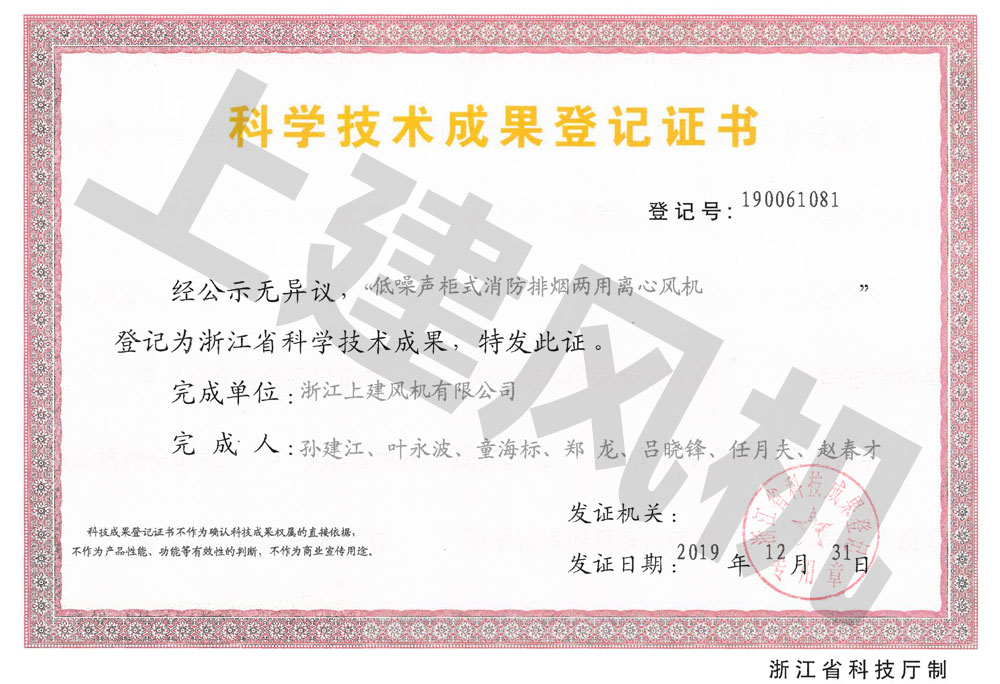 低噪聲柜式消防排煙兩用離心風機箱成果鑒定證書