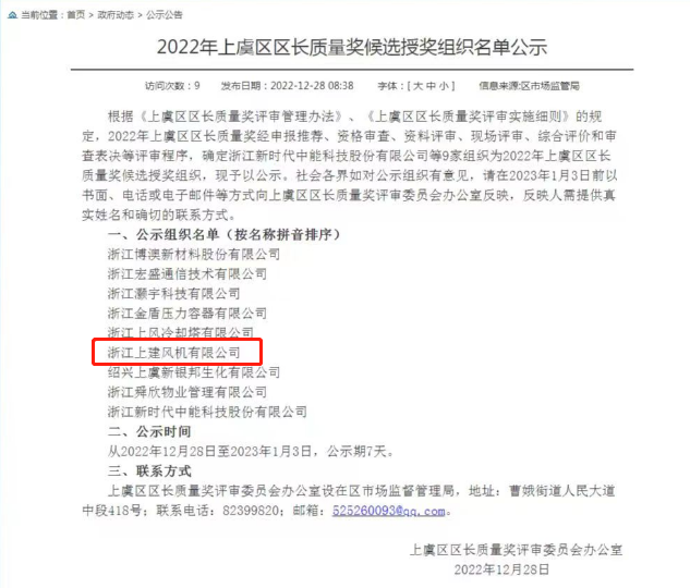 2022年12月,2022年上虞區區長質量獎候選授獎企業名單公示結果顯示,上建風機榮登榜單,獲得2022年上虞區區長質量獎候選授獎。